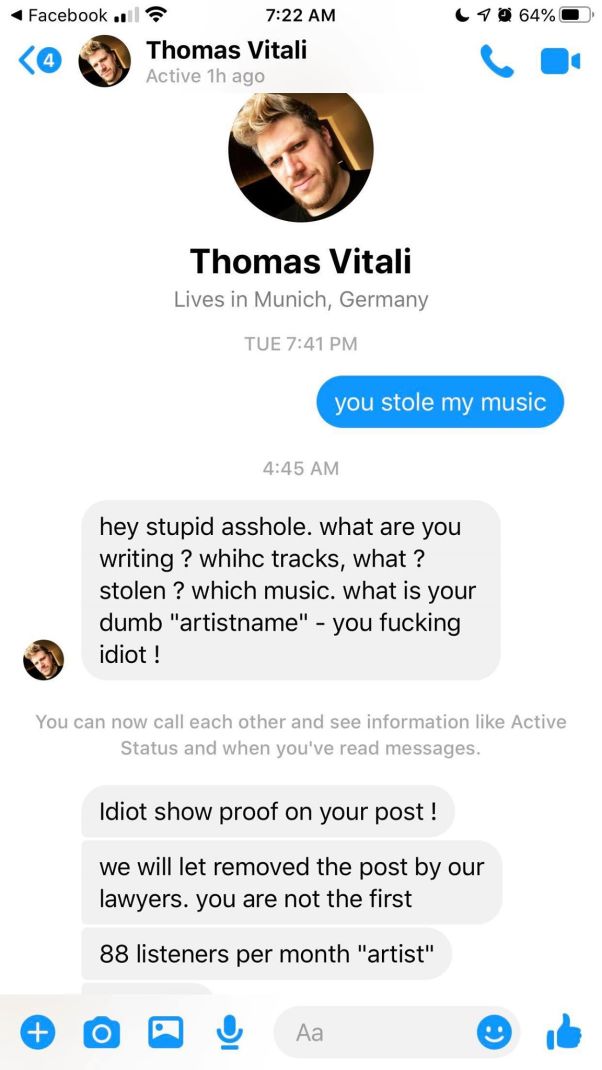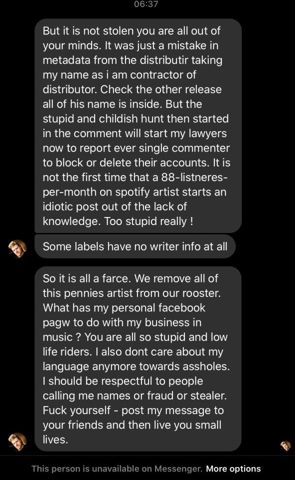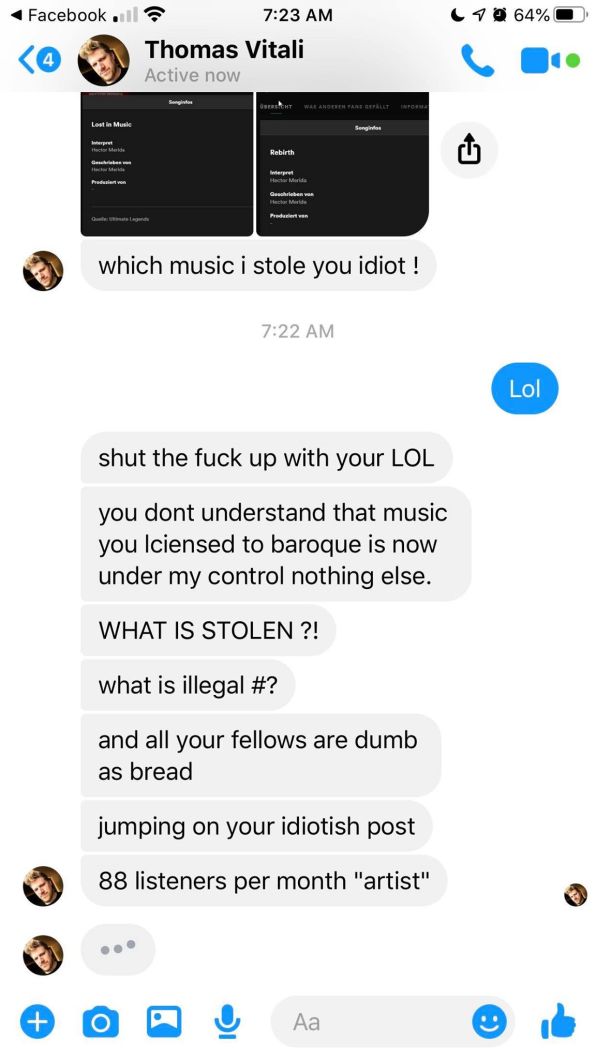 Here he tries to pass it off as mistake in the metadata resulting from the distributor. This is 100% false. A label has to provide the metadata to the distributor. So unless he is a complete incompetent idiot (the jury is still out on that one) there is no way this was a mistake, it was deliberately supplied by him to the distributor. Further, since the music has already been published BEFORE he bought Baroque, HE CHANGED THE DATA AFTER HE BOUGHT THE LABEL. Let’s play his game, let’s say it was a mistake, it would be easy to fix, easier than attacking everyone rightly asking “WTF?!”. So why hasn’t he fixed all the effected music?